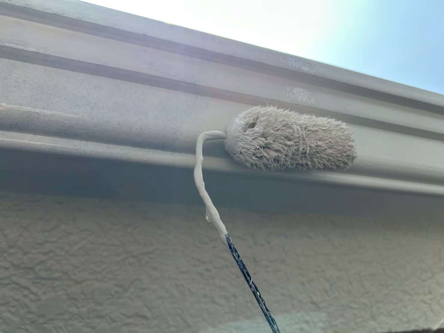 破風板がモルタル壁のため雨樋と色は同じ色ですが使う塗料を変えています。
