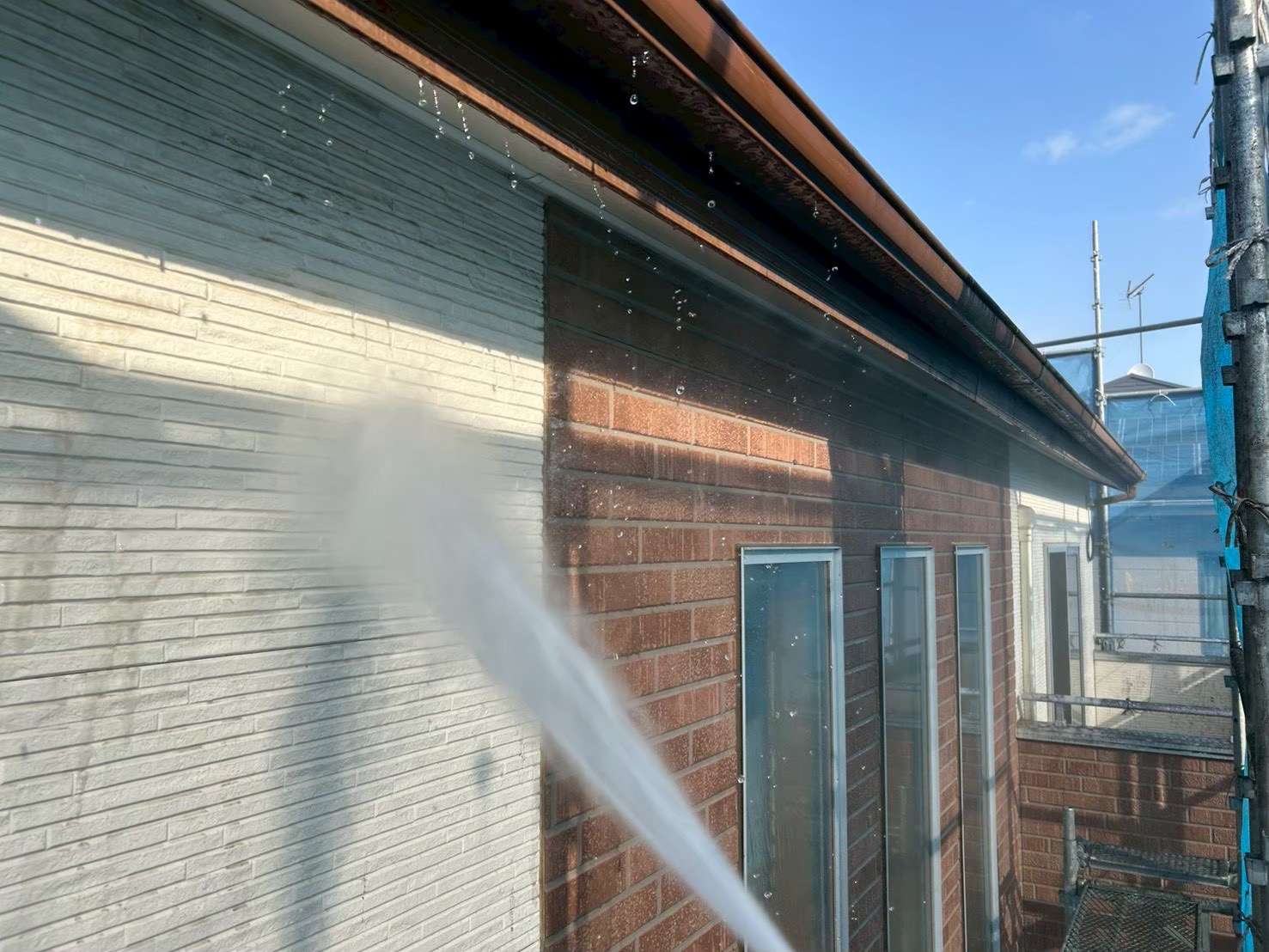 洗浄は外壁だけでなく、雨樋や軒天、ベランダ、土間部分なども一緒に行います。普段なかなか掃除できない場所まできれいになるため、建物全体がすっきりとした印象になります。この段階で「もうきれいになった」と感じられるお客様も多いです。