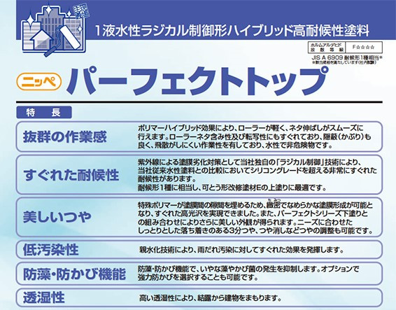 外壁塗料には日本ペイントの人気商品、ラジカル制御形塗料「パーフェクトトップ」を使用させて頂きました。