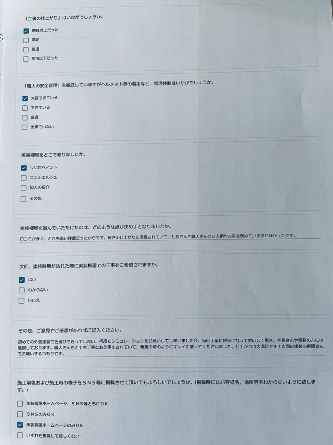 始めての外壁塗装で色選びで迷ってしまい、何度もシュミレーションをお願いしてしまいましたが、毎回丁寧に親身になって対応して頂き、社長さんや事務の方には感謝しております。職人さんもとても丁寧なお仕事をされていて、新築のようにキレイに塗ってくださいました。仕上がりは大満足です!次回の塗装も柳屋さんでお願いするつもりです。