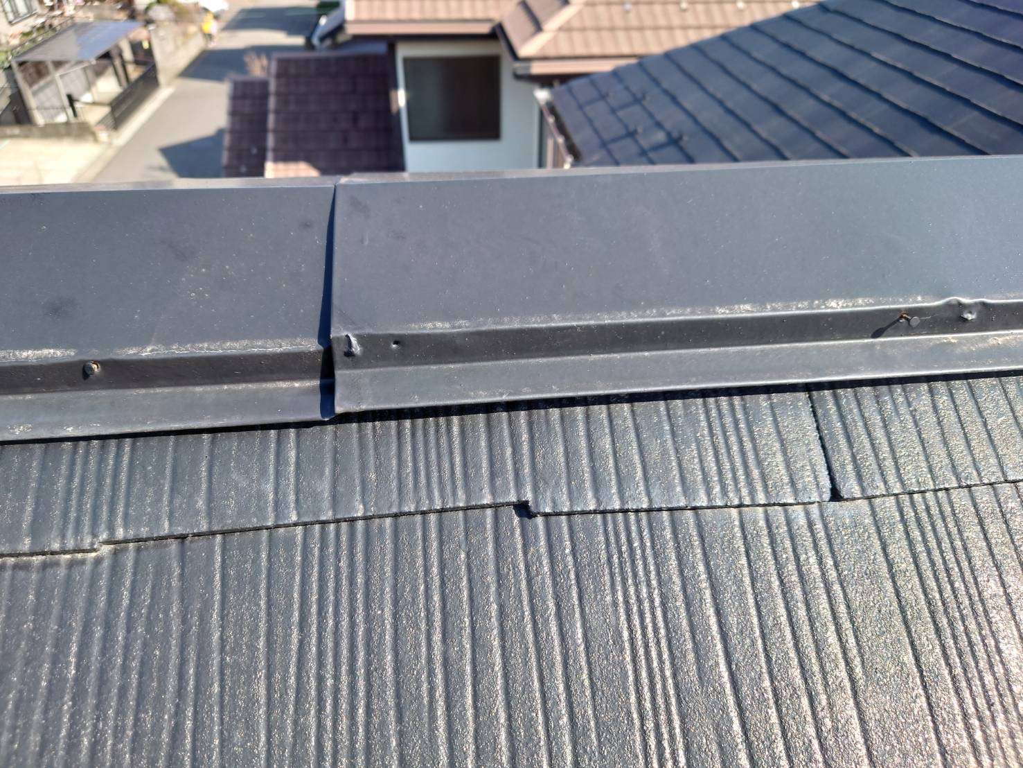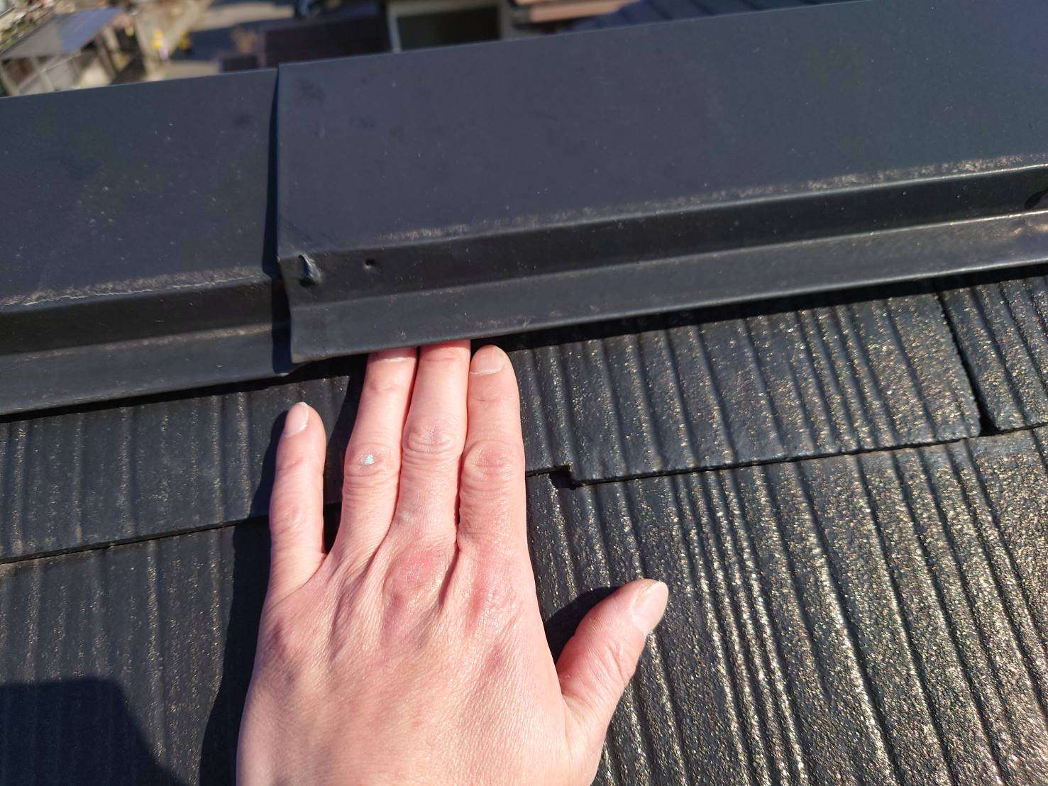 屋根に上る前にお客様にお話を聞いたところ、その業者は屋根に上がってスマートフォンで写真を撮り、10㎝程浮いてしまっている棟板金の画像を見せ、「こんなに浮いてしまって下地もダメになっています」とお客様に話してきたそうです。