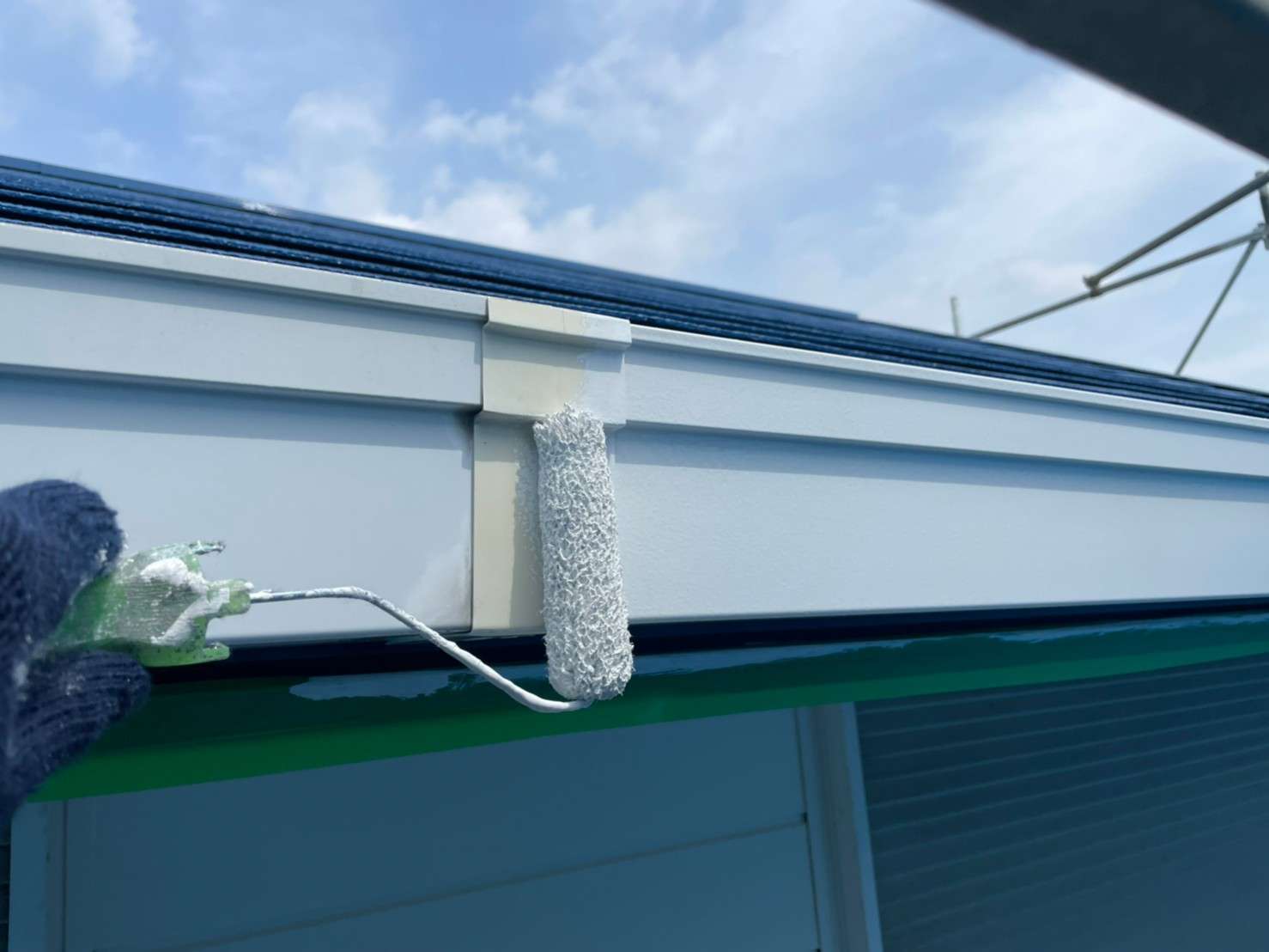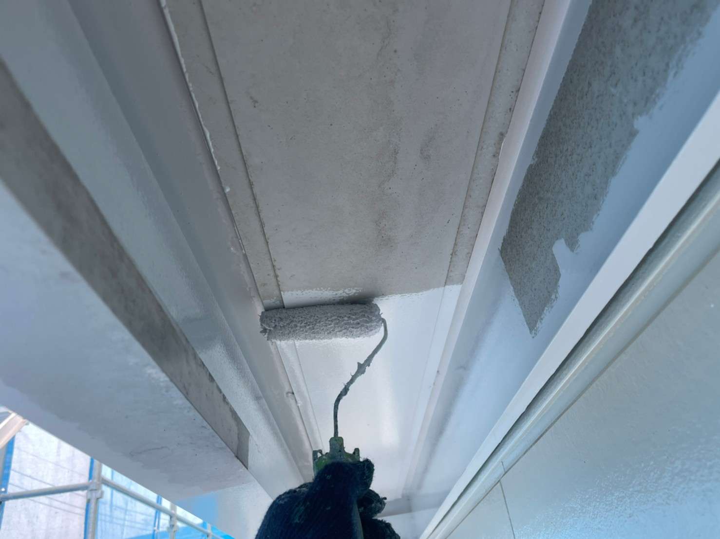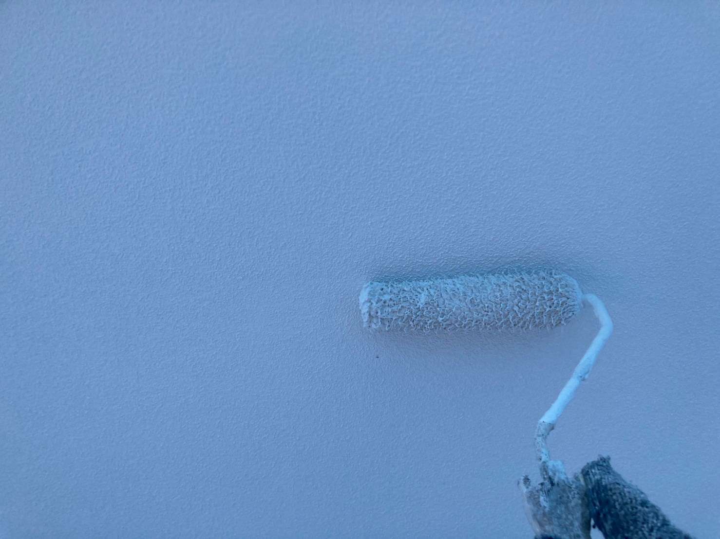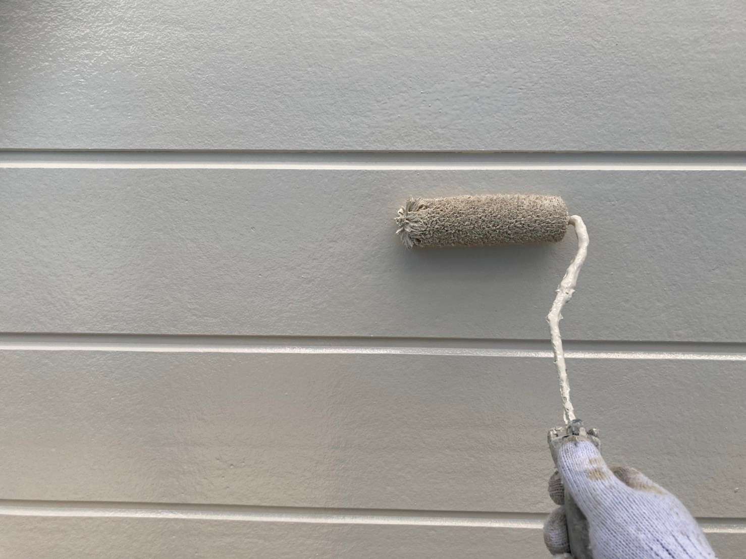 古い塗膜の剝がれなどをペーパーやマジックロンでケレンをし、下地を調整してから下塗りを1回(SBフィーラー)、中塗り・上塗り(ファインシリコンセラUV)で2回塗りをします。