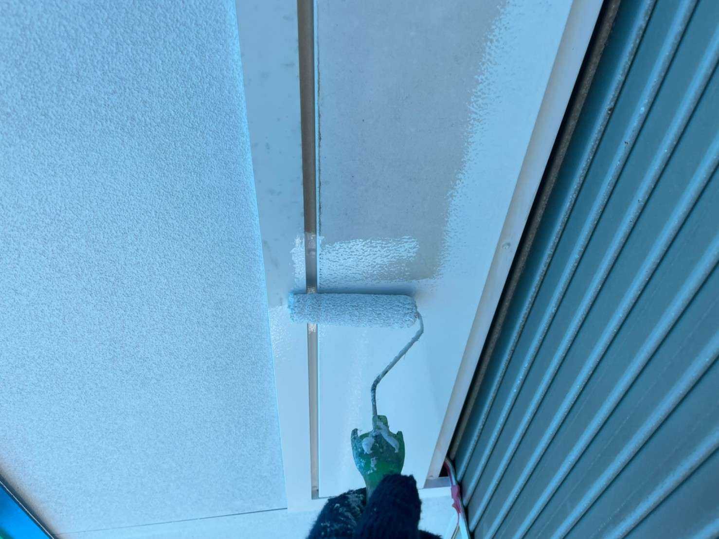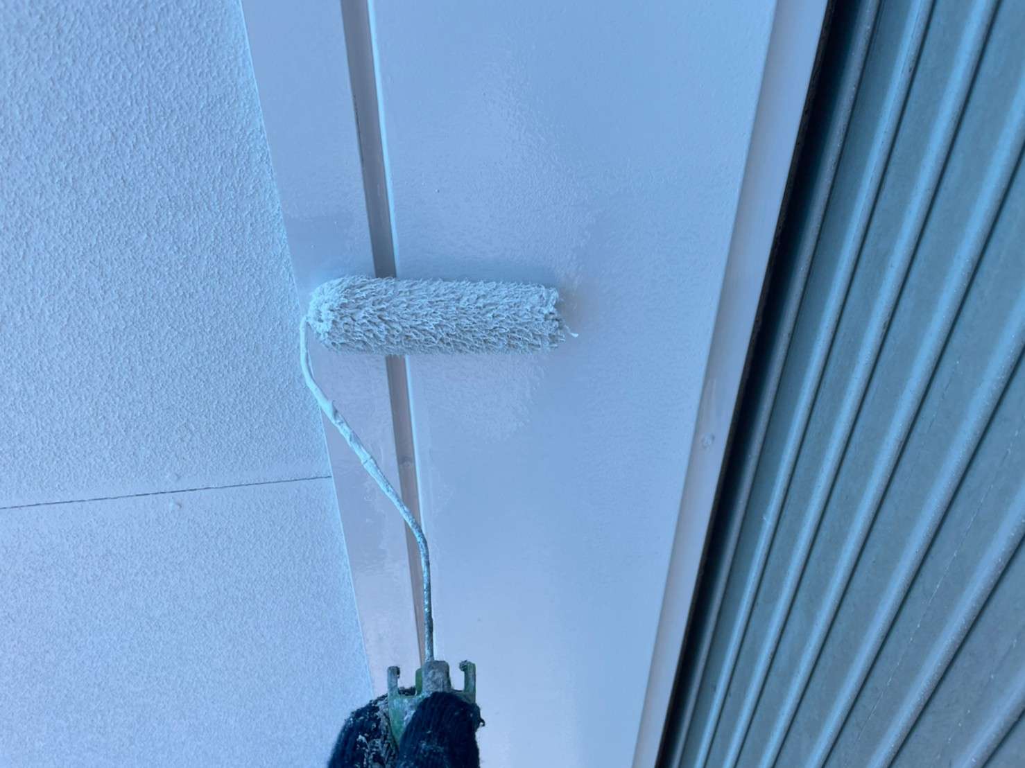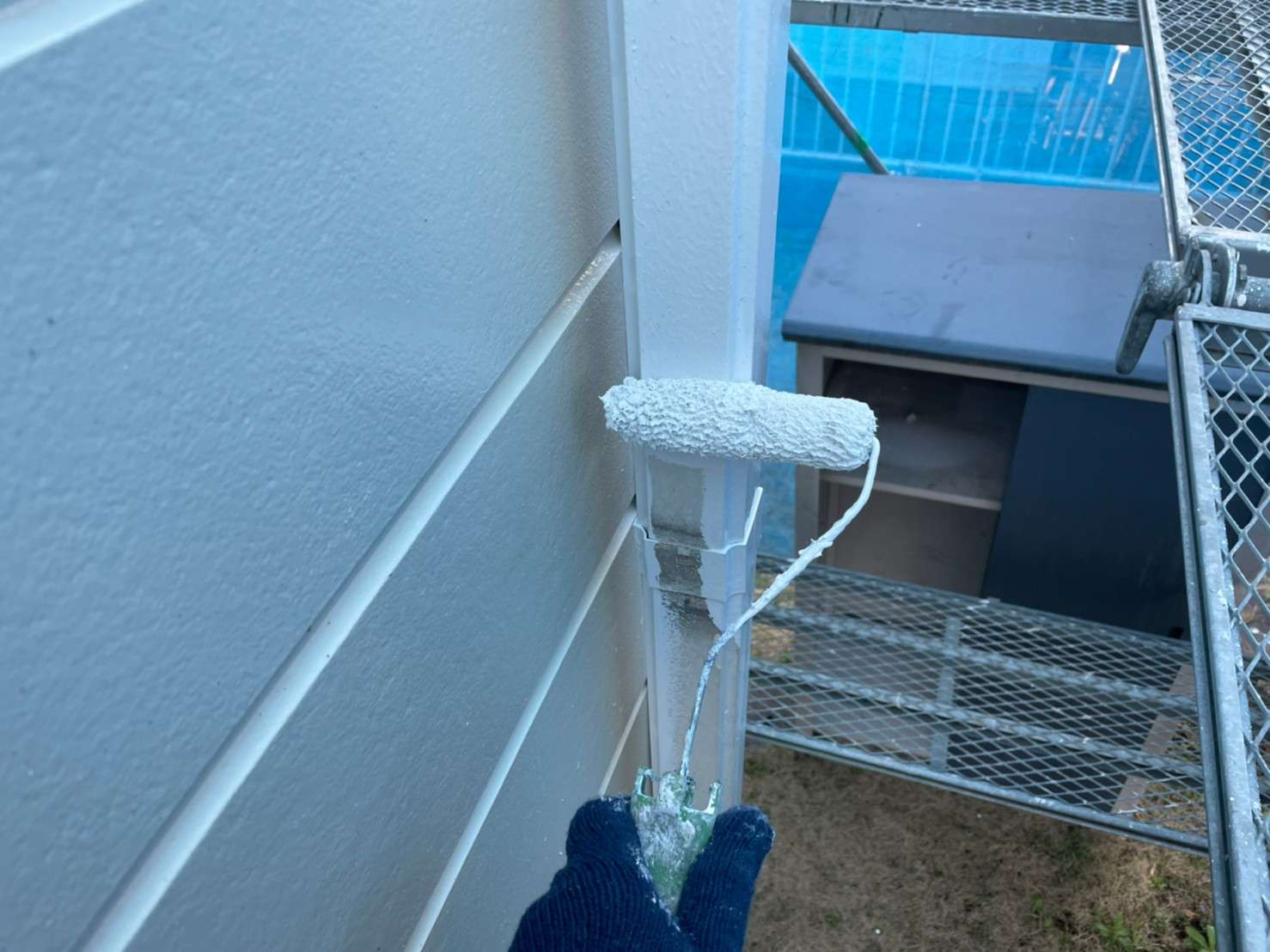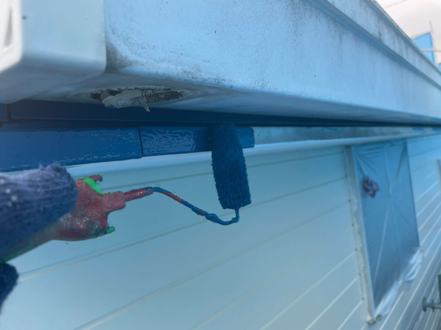 古い塗膜の剝がれなどをペーパーやマジックロンでケレンをし、下地を調整してから下塗りを1回(SBフィーラー)、中塗り・上塗り(ファインシリコンセラUV)で2回塗りをします。