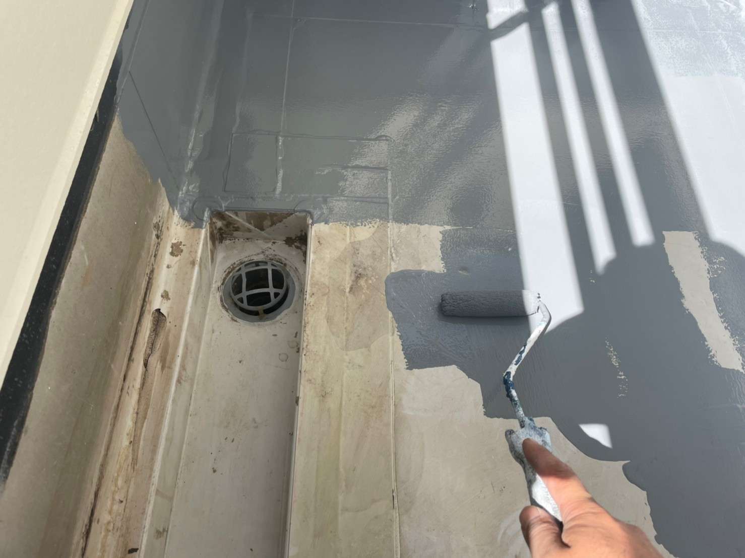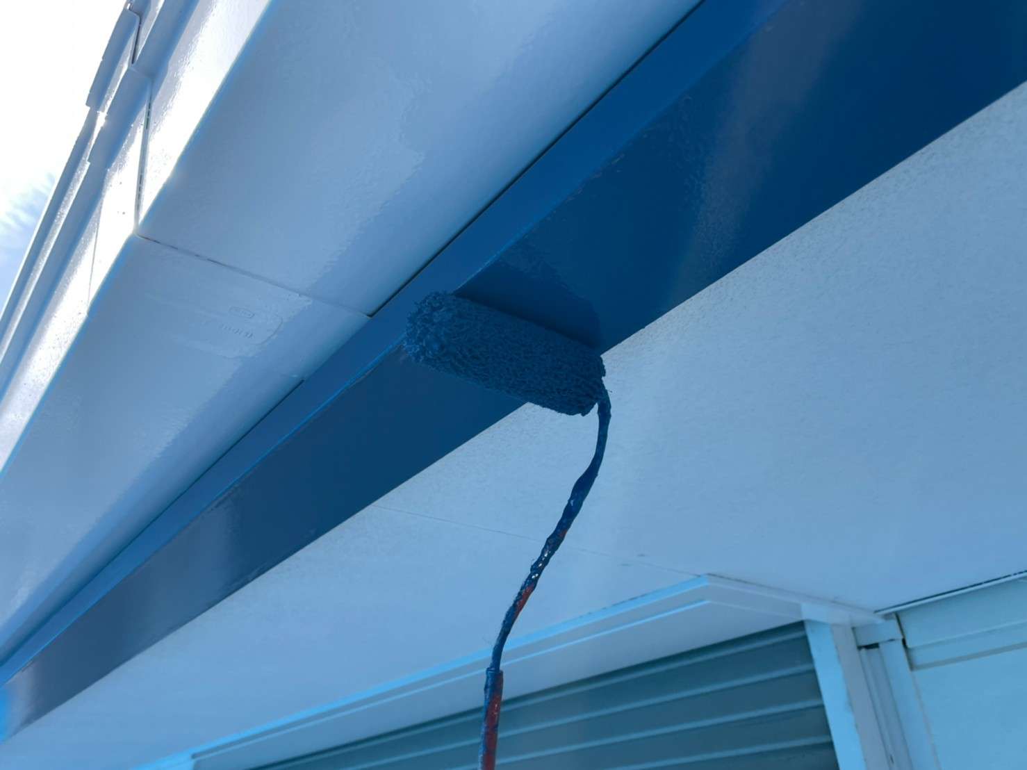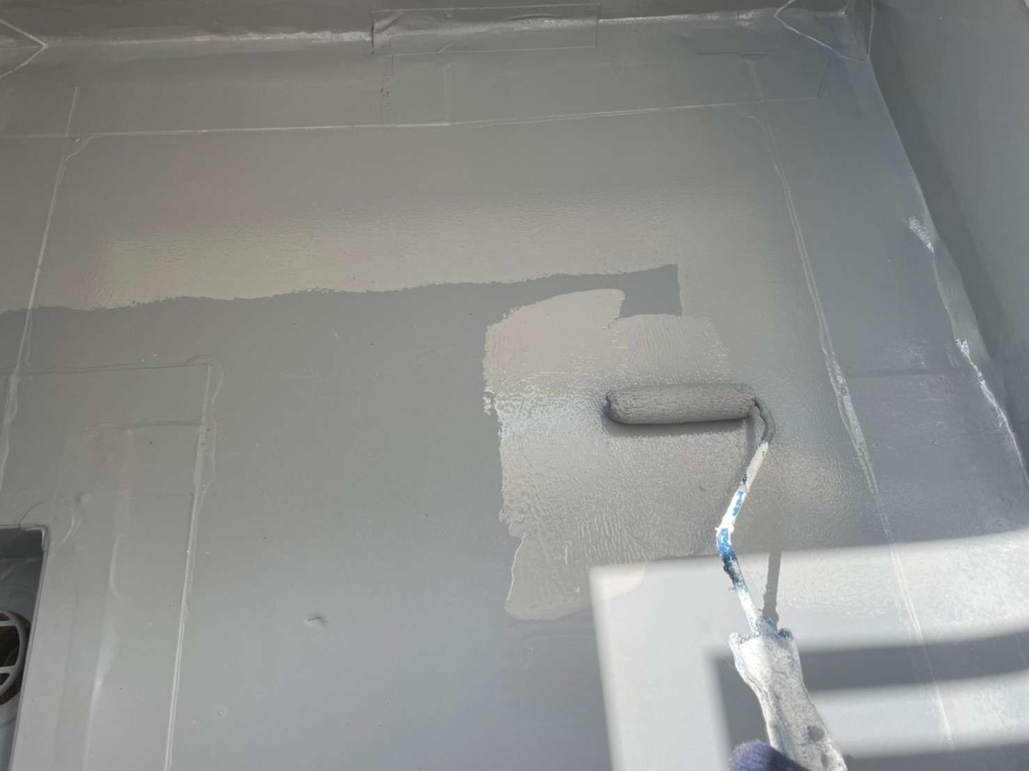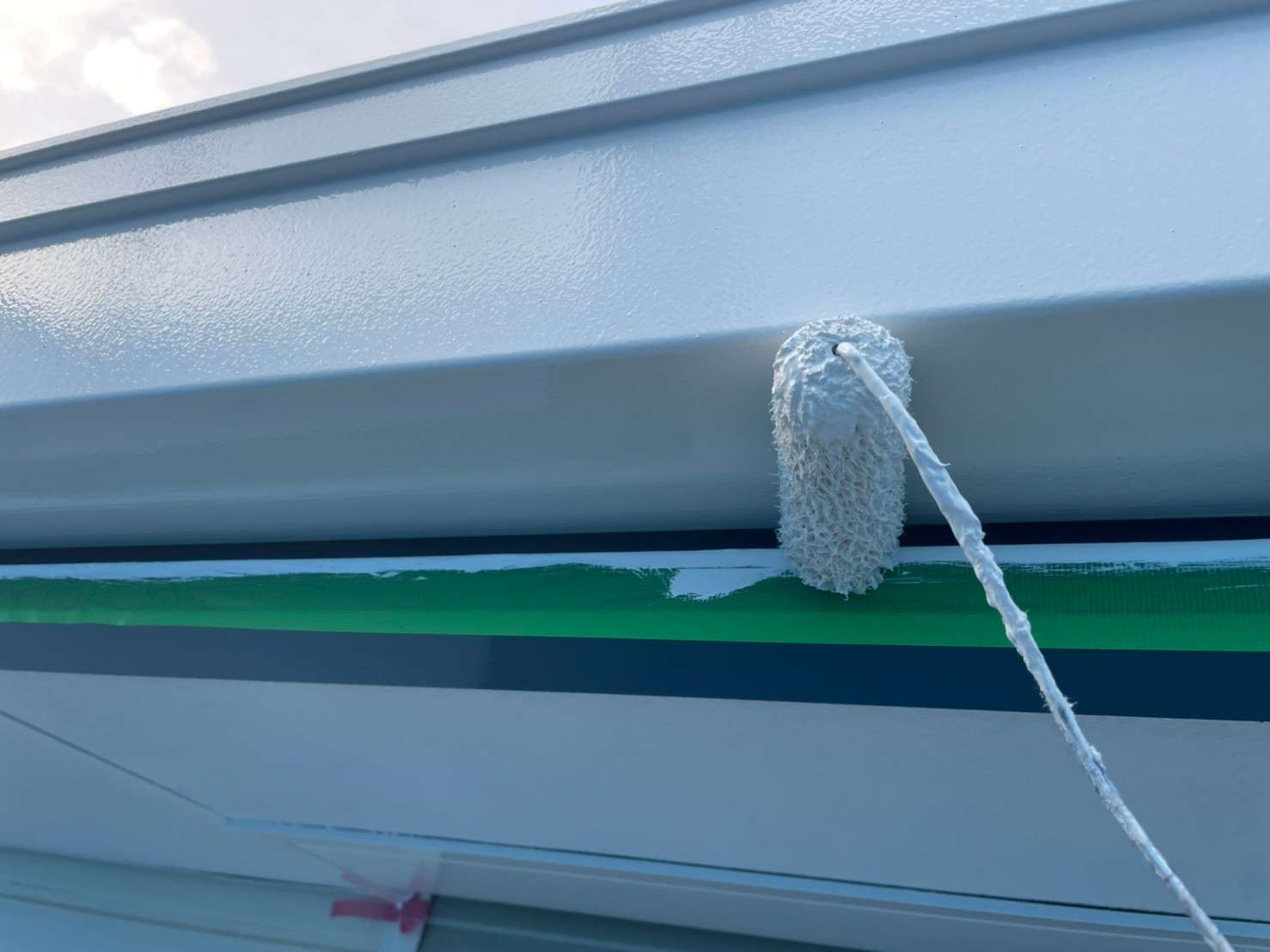 古い塗膜の剝がれなどをペーパーやマジックロンでケレンをし、下地を調整してから下塗りを1回(SBフィーラー)、中塗り・上塗り(ファインシリコンセラUV)で2回塗りをします。