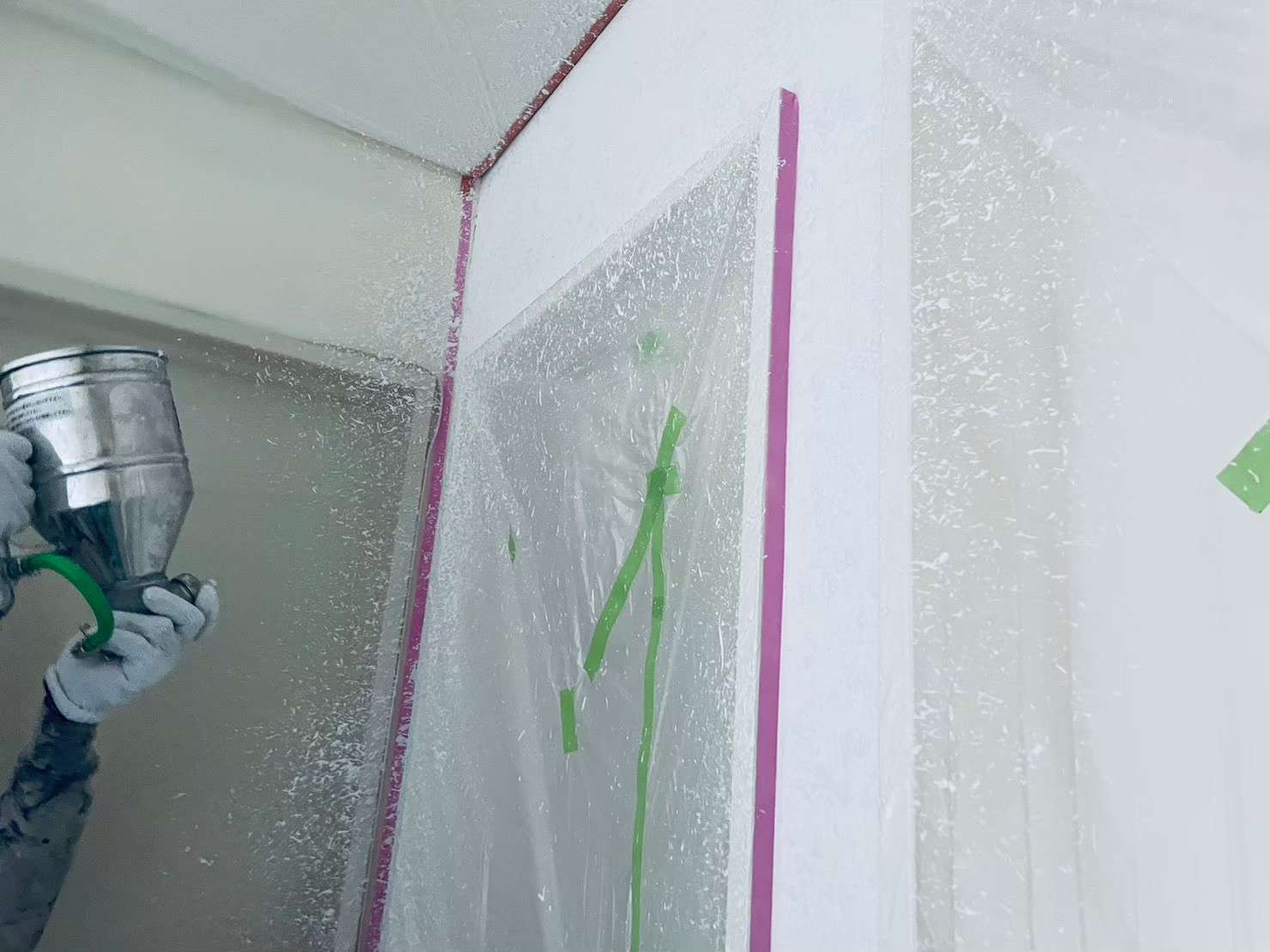 吹付け塗装は、周りに飛んでしまうことが多い施工方法なので、特に内装という事で、しっかり養生をし、吹付け塗装をやらせていただきました。