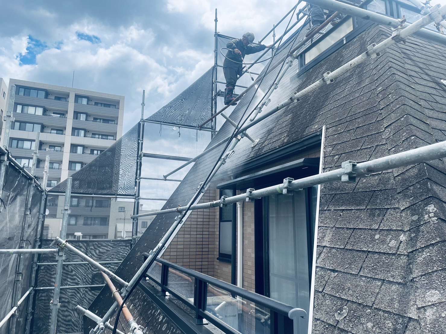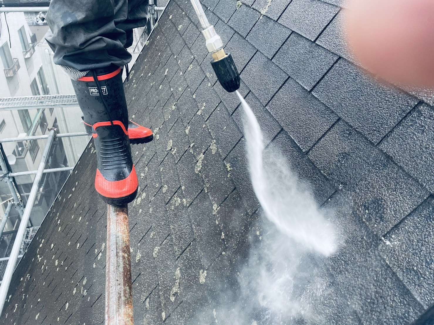 本日は、東京都江東区のマンションの屋根・外壁塗装、屋上防水を施工します現場の洗浄作業です。