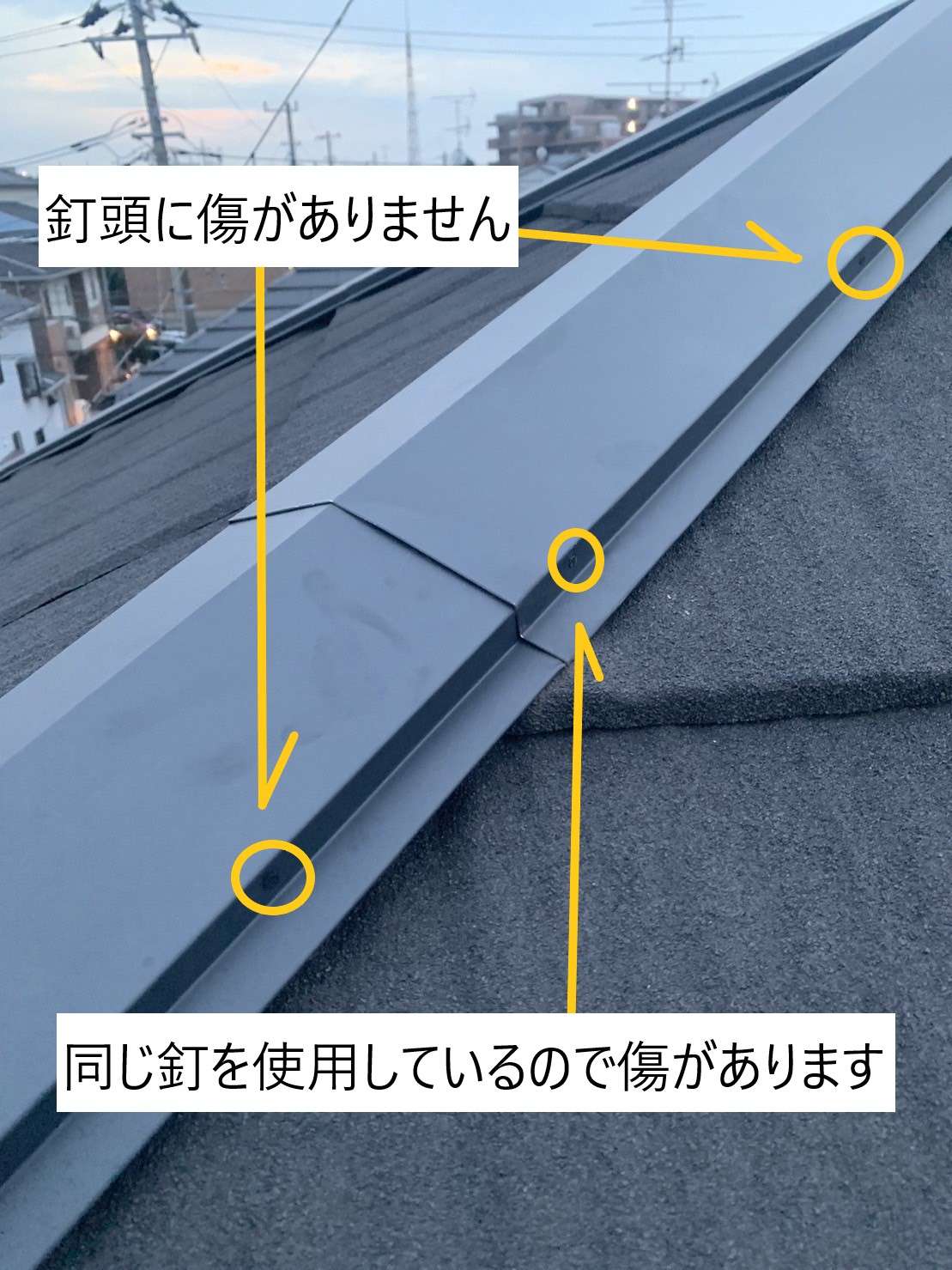 貫板は木製ですので、仮に貫板を交換していなかったら、木が朽ちていて釘が効かないこともありますが、新品の物を交換してありますので、貫板が原因とは考えにくいのです。