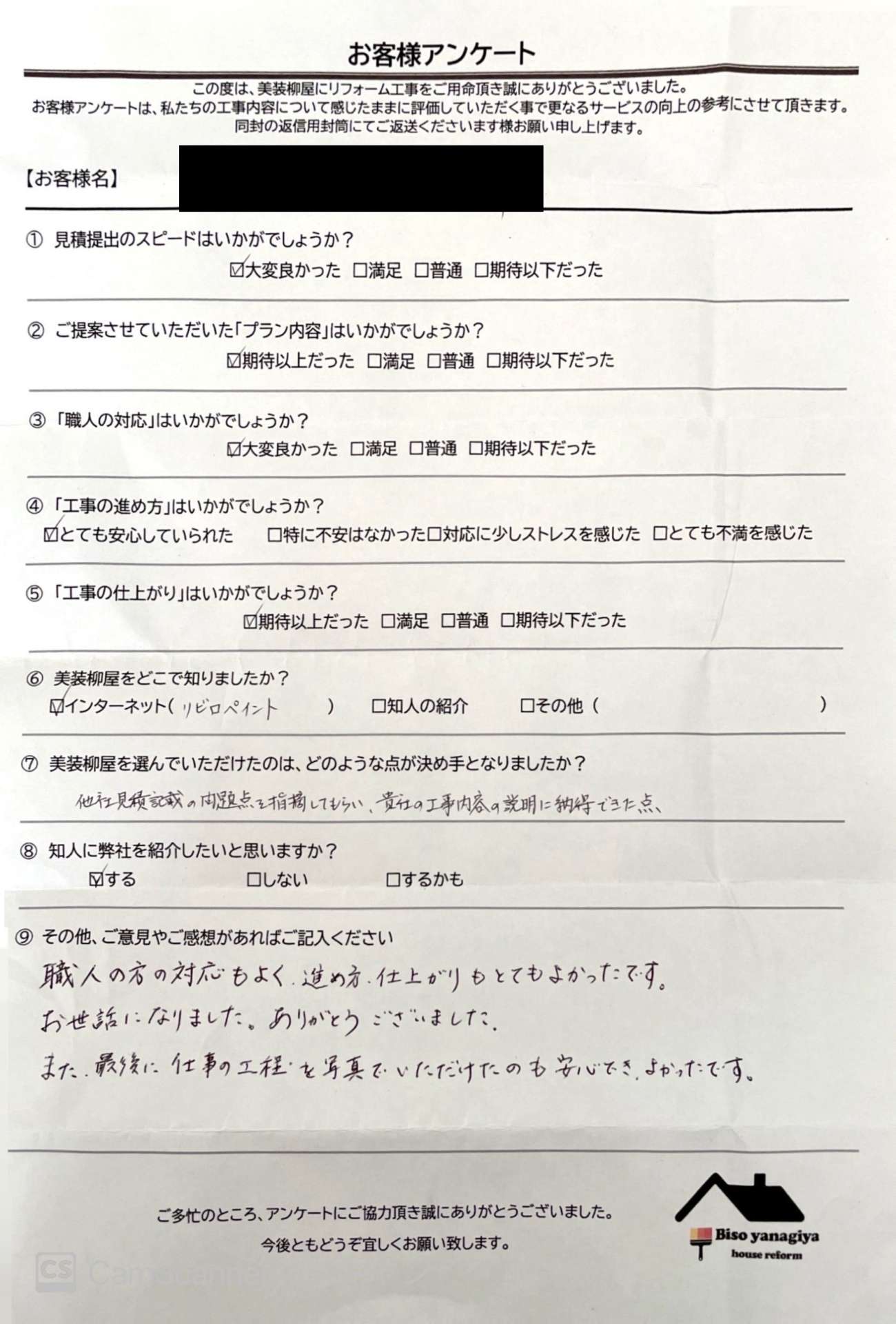 「お客様アンケート」は施工いただいたお客様に、施工後の完了書類と一緒にお渡ししておりますが、多くのお客様からご返答いただけて、今後の励みになります😊