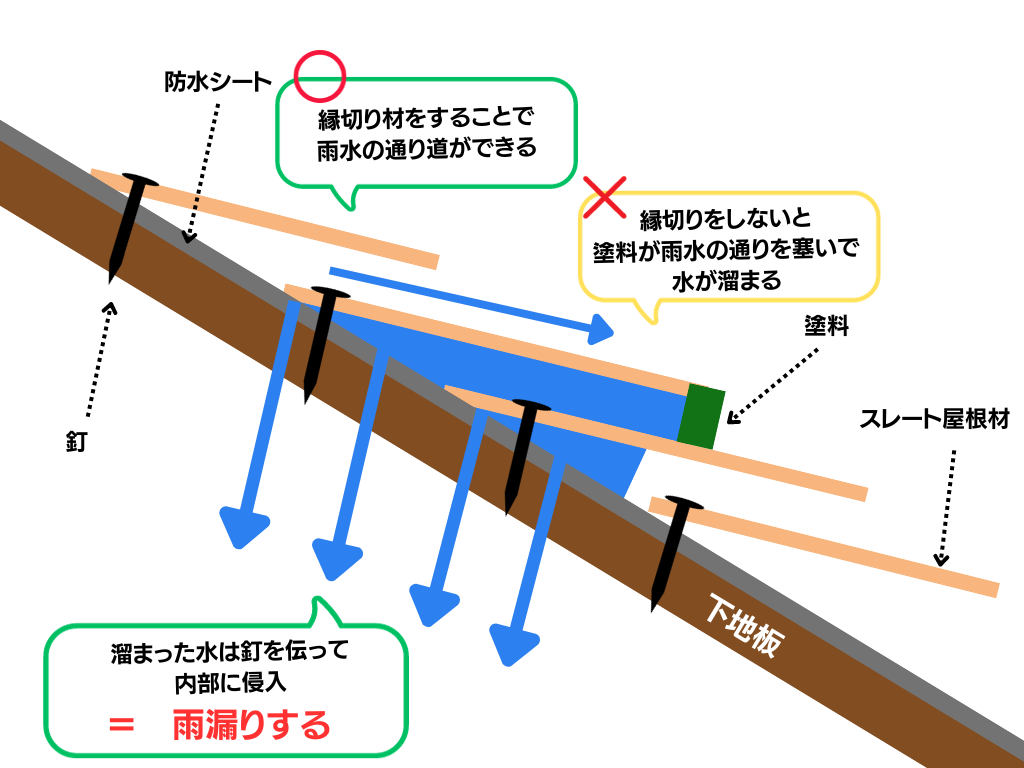 縁切りを行わないと屋根材同士がくっついたままになり、水はけが悪くなって雨漏りや内部結露を起こしてしまします。