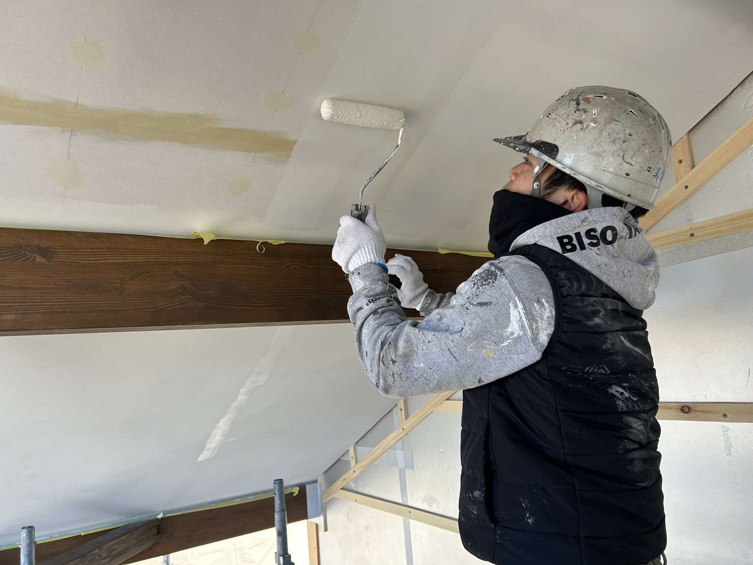 野田市にありますB工務店さんからのご依頼をいただき、野田市に建設中の戸建て新築住宅の軒天井塗装をしました。