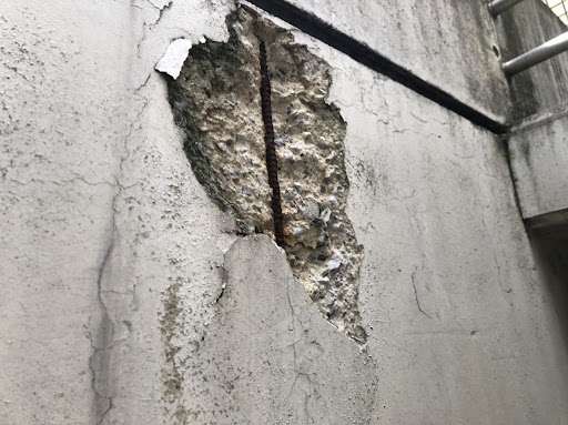 コンクリート壁やモルタル壁の「爆裂現象」とは、内部の鉄筋が錆びたことで鉄筋そのものの体積が増してしまい、膨張することで外側のコンクリート引きやモルタル壁が内部から押されて、破壊してしまう事を言います。