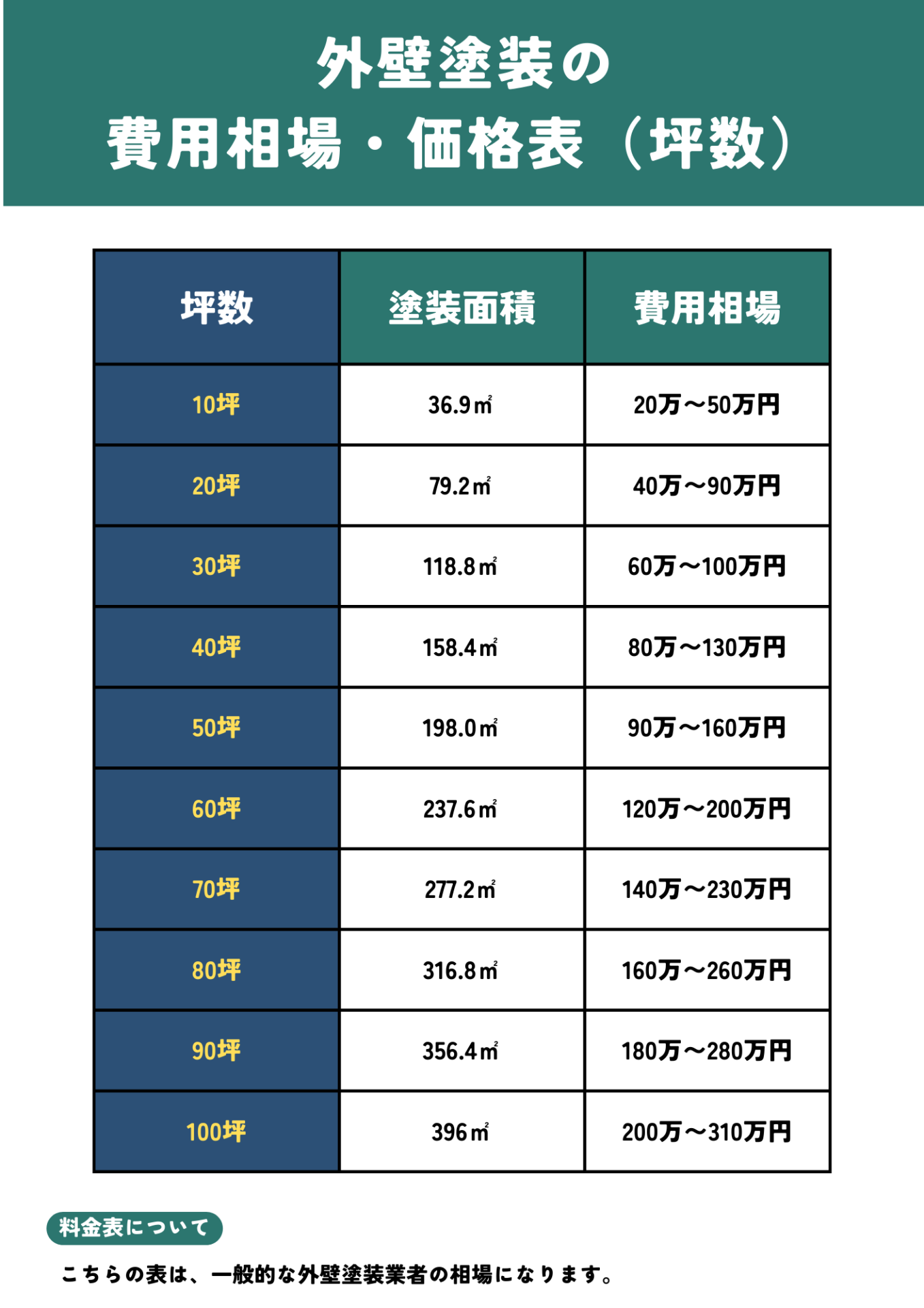 外壁塗装工事にかかる費用の相場を20〜100坪の坪数ごとに例示し、かかる費用の内訳につても解説しています。