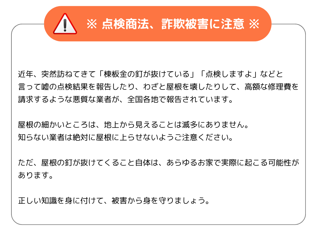 これはほとんどの場合、経年劣化が原因なので、このまま放置しておくと雨水の侵入などの心配があります。