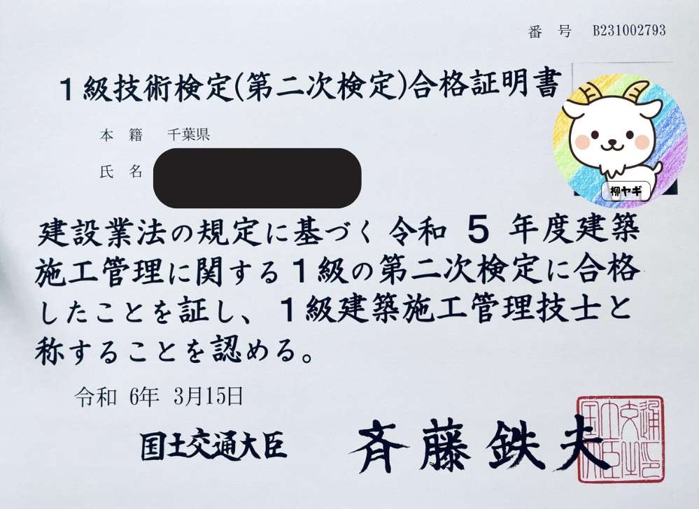スタッフが一級建築施工管理技士の合格し、合格通知と引き換えで取り寄せ依頼(任意)していた合格証明書やっと届きました😊