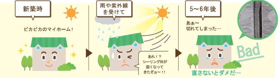 外壁の塗料を高くて良い性能のものを使用したとしても、シーリングの耐用年数が少なくては、次のメンテナンスまで、持たせる事ができません。
