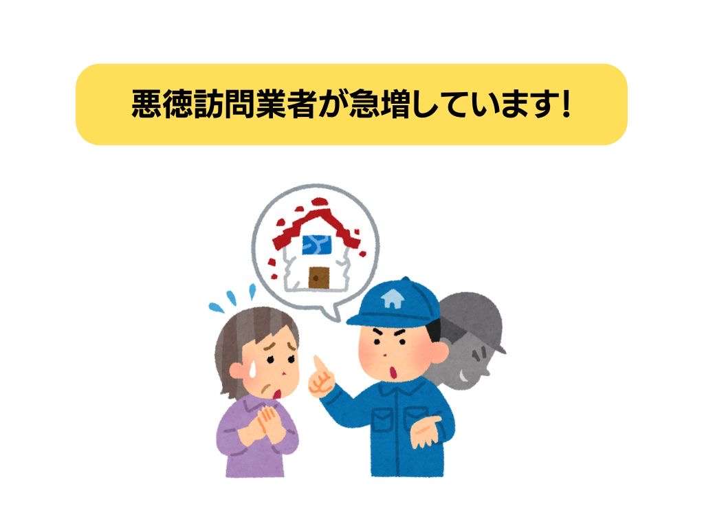 本日は、以前から注意喚起しております「悪徳訪問業者」についてお話しさせていただきます。