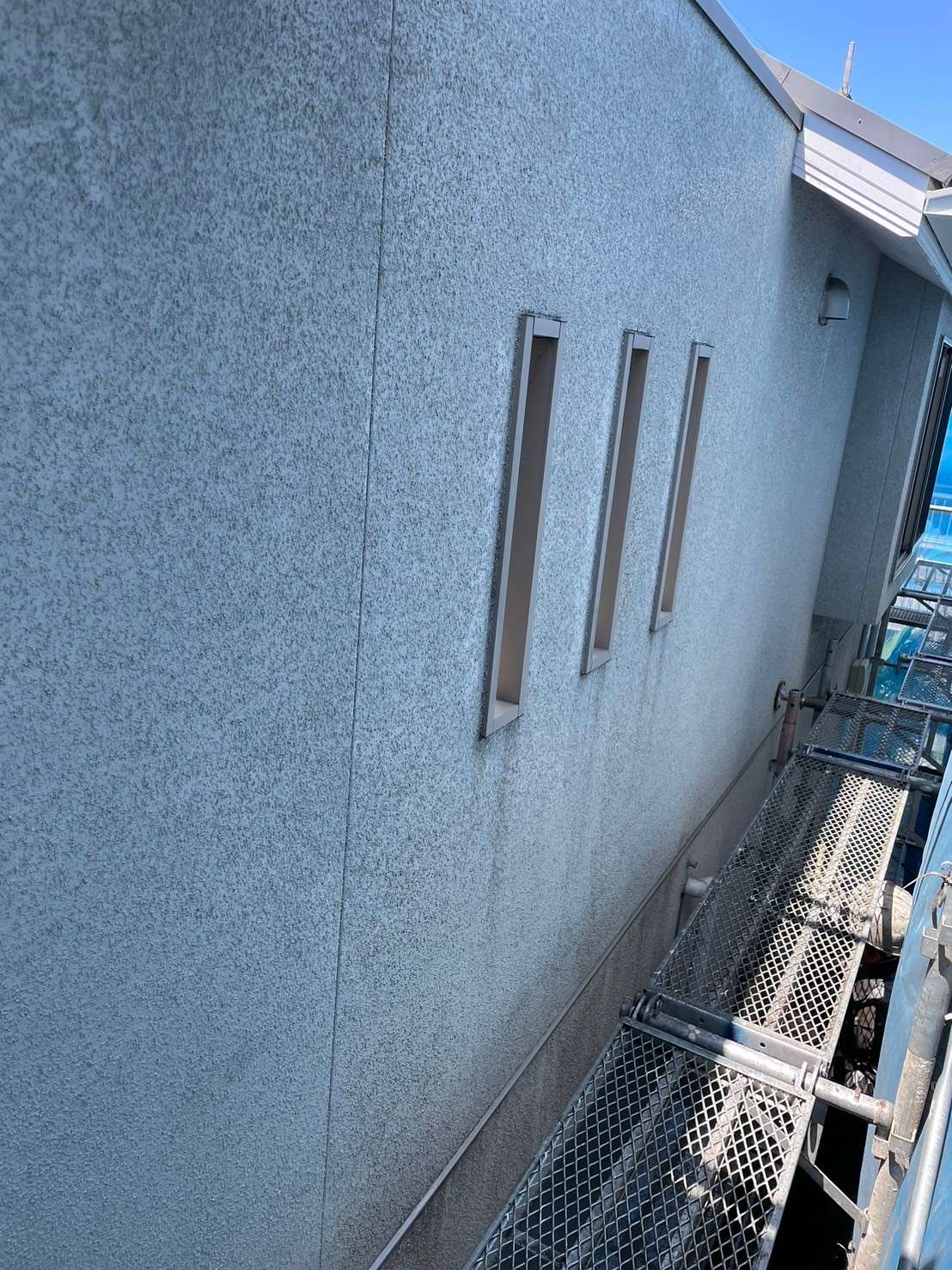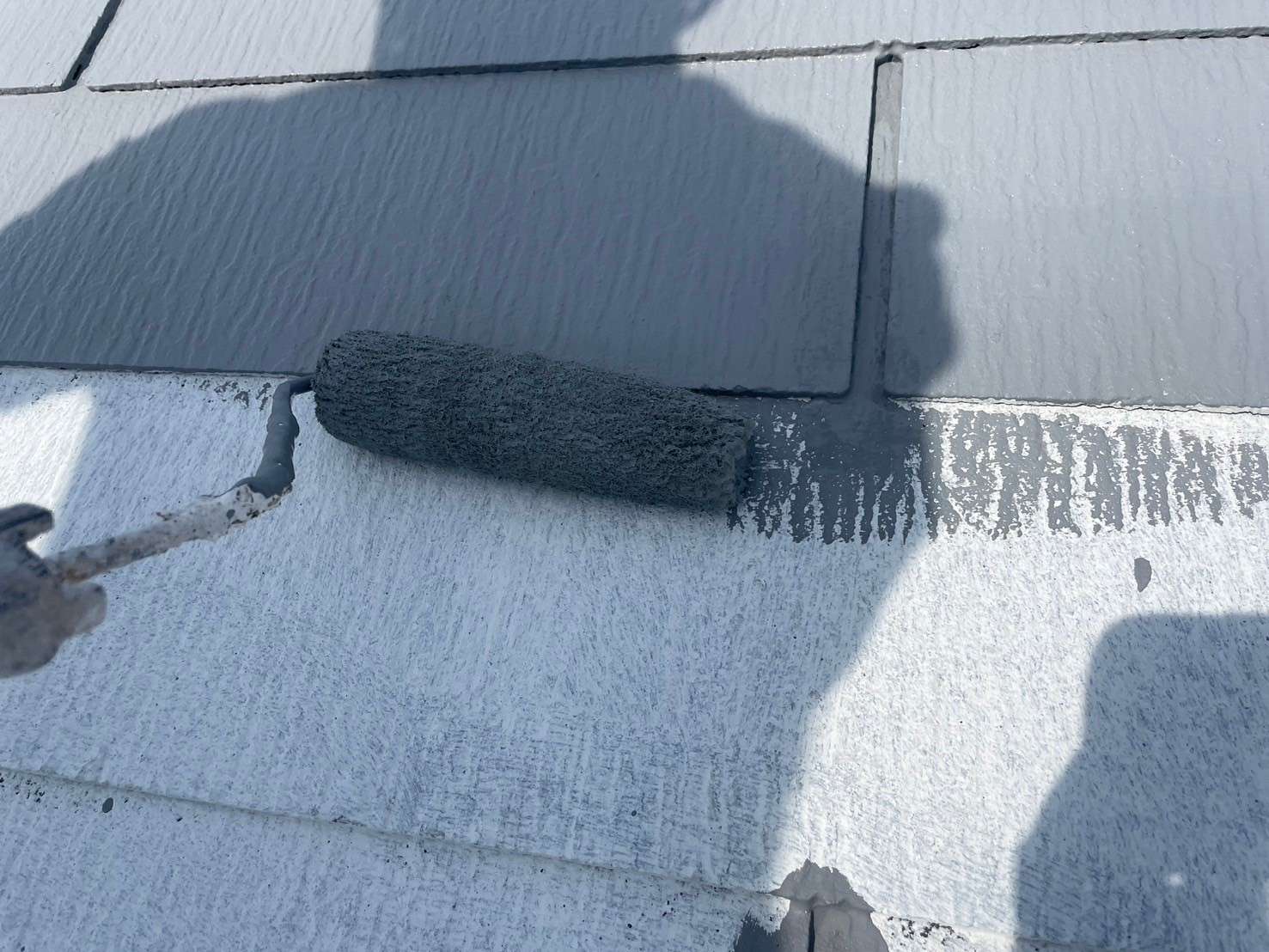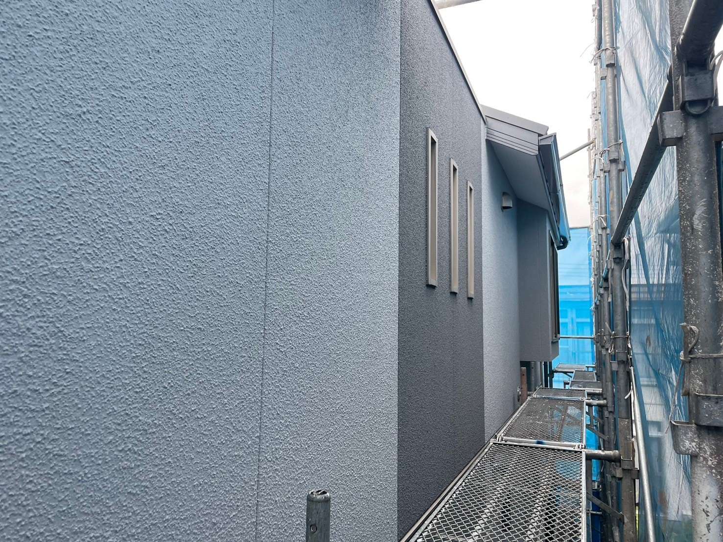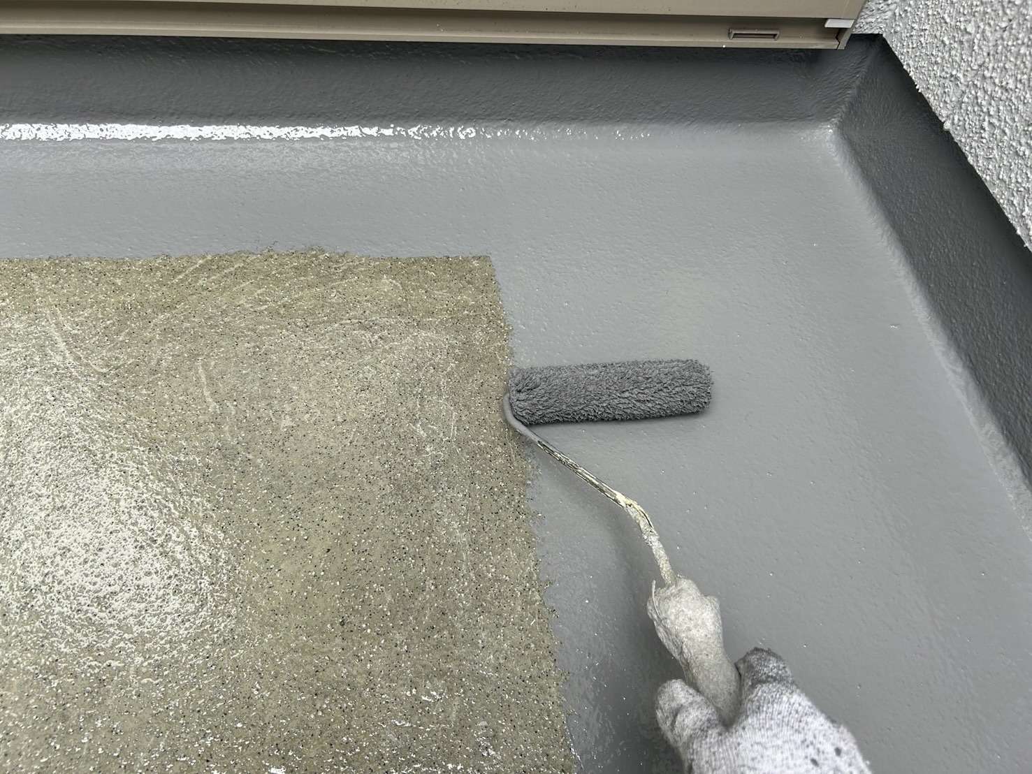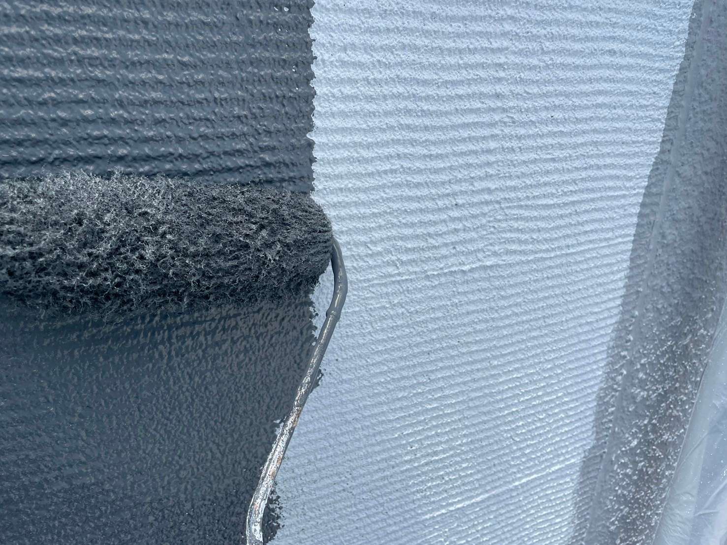 グレーの濃淡で、アクセントとメインの部分で色を変えることで、とてもバランスが良くまとまっていて、「ガイナ」で遮熱効果がありつつ、汚れやすいベランダ開口部面には、「パーフェクトトップ」を使用して、汚れにも特化した施工となりました(*´꒳`*)