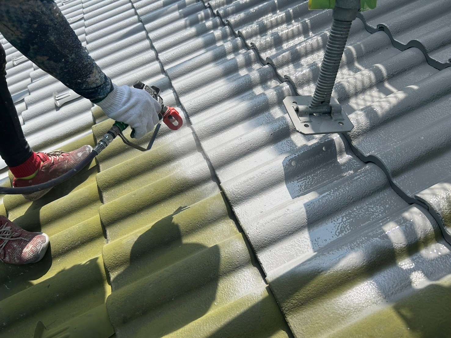 本日の作業は、屋根塗装工事の、下塗り・中塗りです。