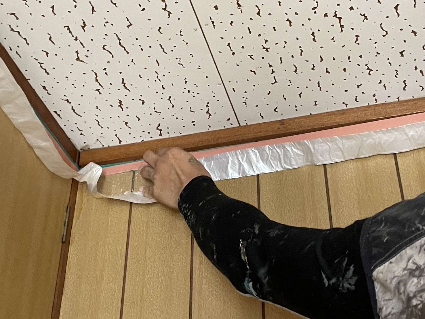 室内塗装は、「天井」「枠」部分のみなので、クロスや床などの他内装を汚さないように、しっかりと養生していきます。