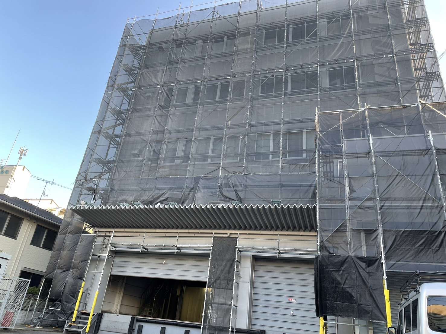 今回の工場跡地の改修工事では、建物の長寿命化と美観の回復を目指し、屋上防水工事と外壁塗装工事を進めています。