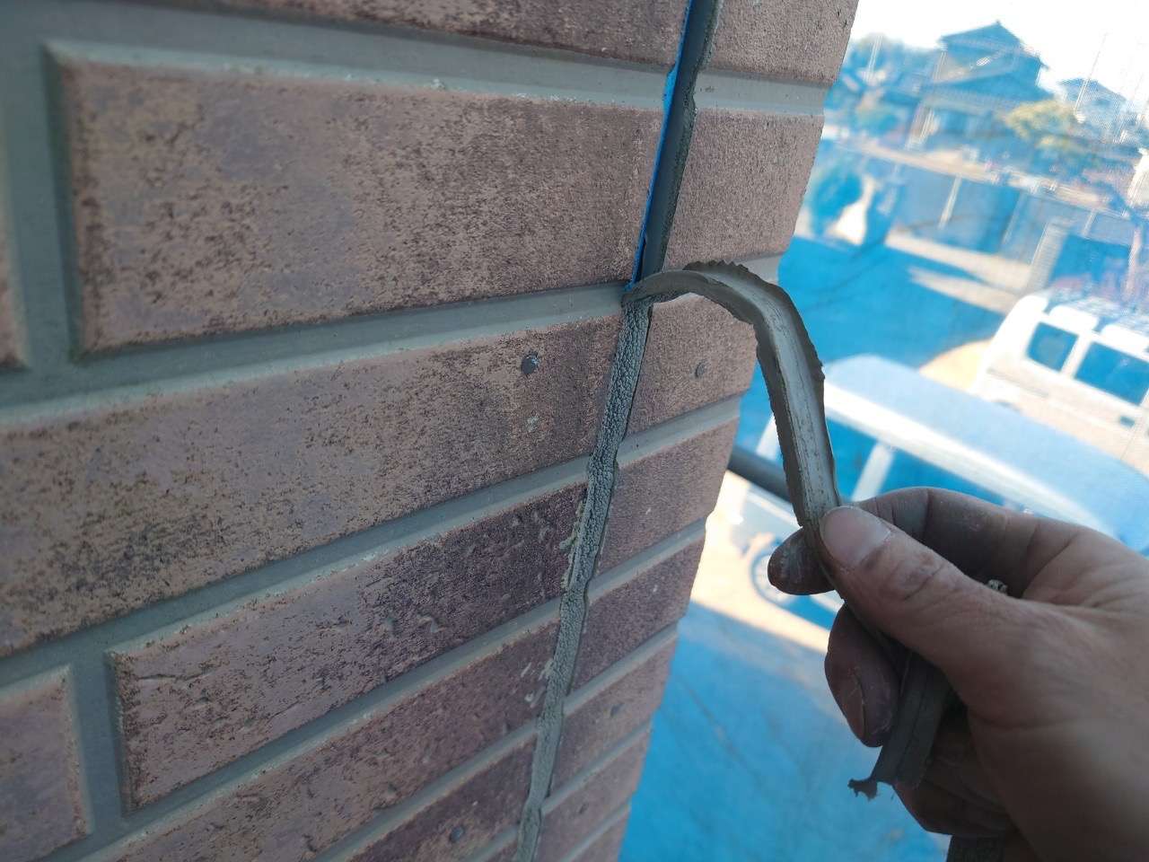 施工したばかりのコーキングは、指で押すとしっかりした弾力が感じられます。