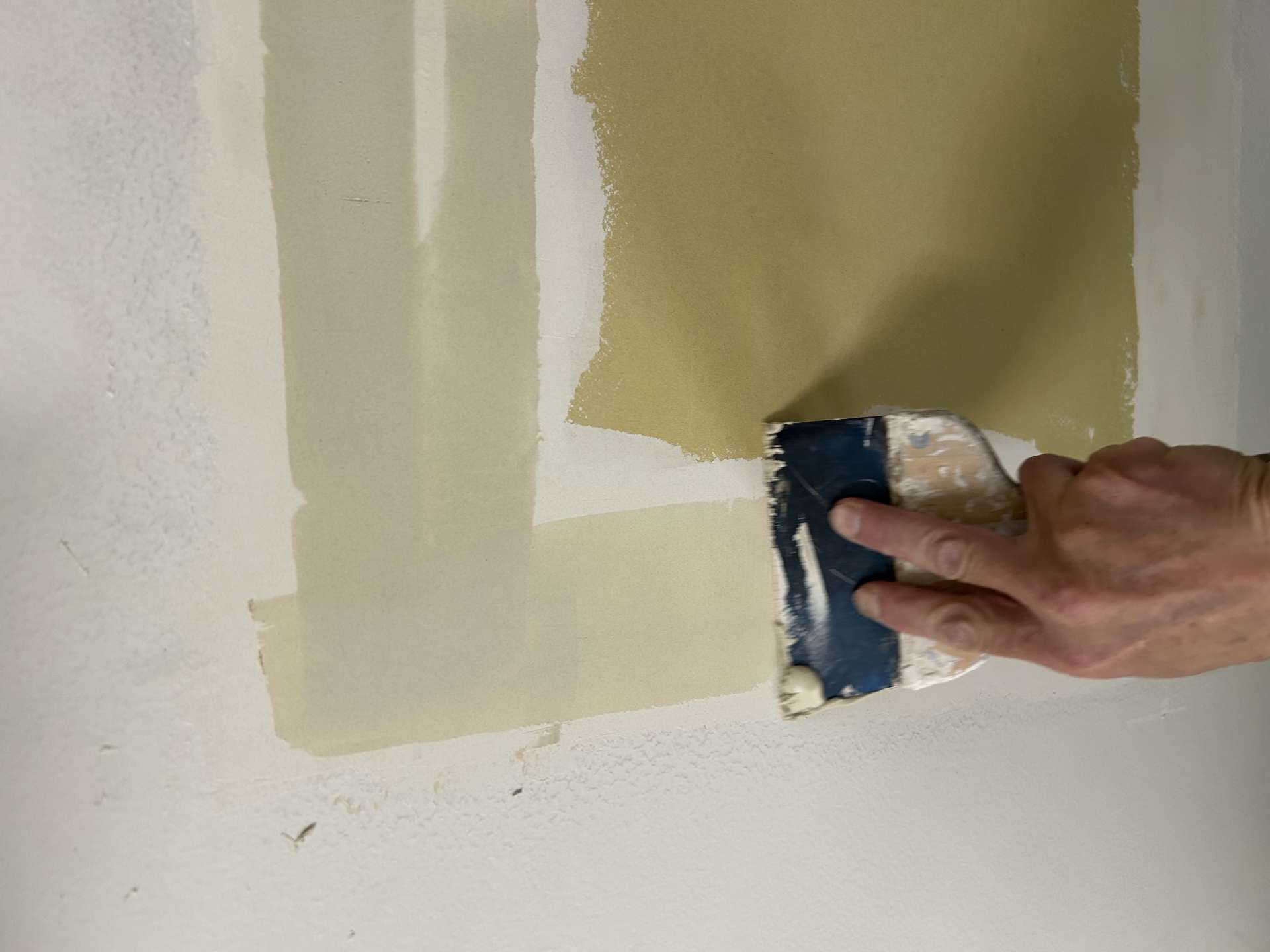 最終仕上げとして、さらに広範囲に薄くパテを塗布し、目視でわかる凹凸を埋めていきます。薄塗りを意識しながら、均一に仕上げることが大切です。ここでの丁寧さが最終仕上げ(クロスや塗装)の美しさに大きく影響します。