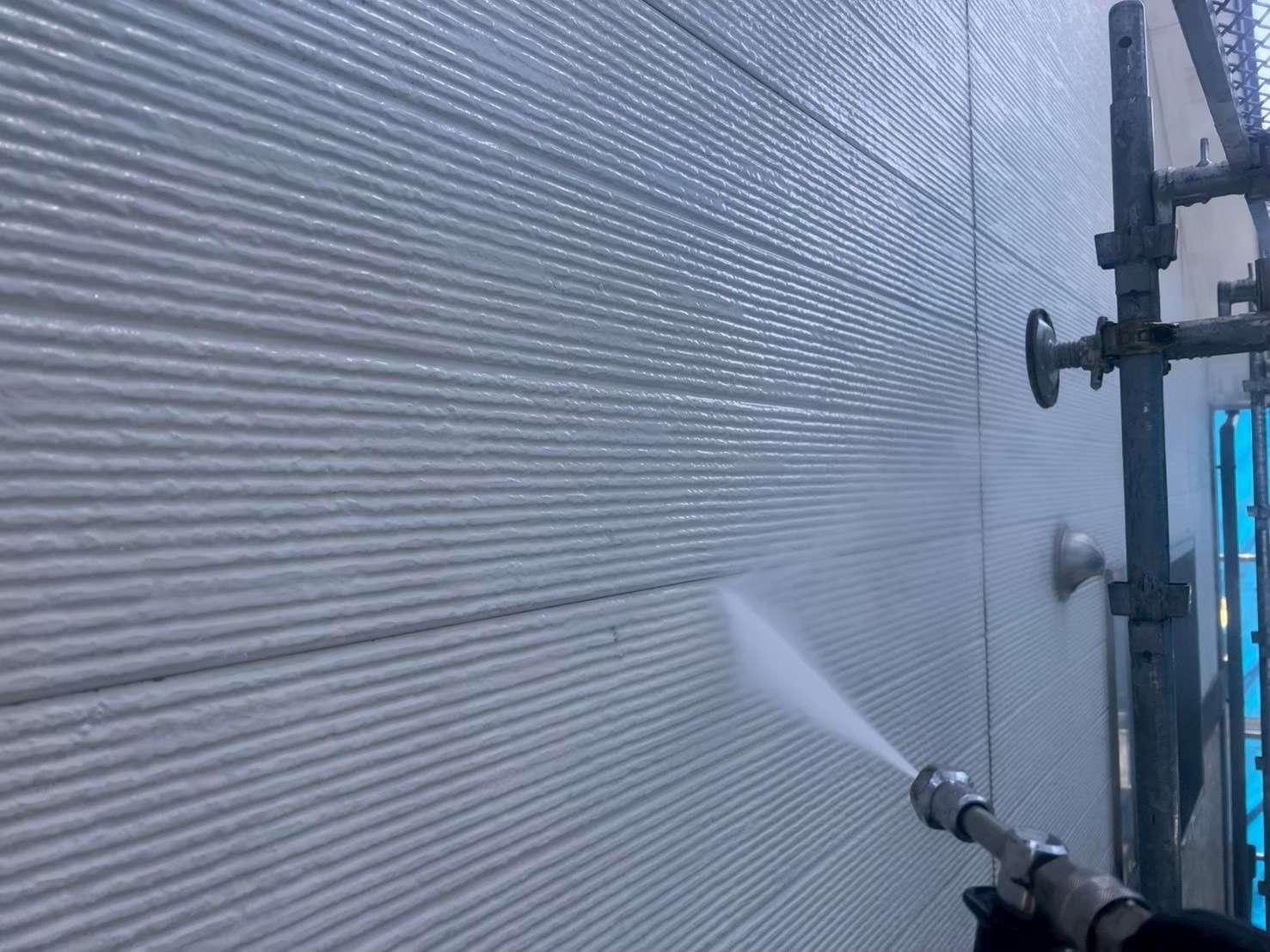 高圧洗浄は塗装工事の大切な第一歩。しっかりと汚れを落とすことで、塗料が長持ちし、美しい仕上がりになります。