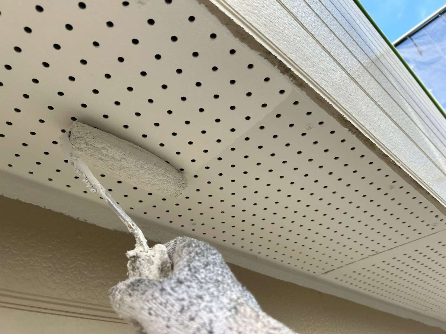 その中で、最初に行うのが「軒天井(のきてんじょう)」の塗装です。