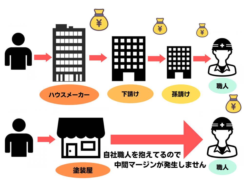 極端な例ですが、大手メーカーや工務店などに頼むと中間マージンとして手数料を上乗せしたお値段になるので、価格差を生み出してしまうのです。
